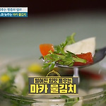 마카의 맛은 어떨까?고추냉이 맛 같은 느낌이에요식감 같은 건 밤고구마 같은데 엄청 맵네요좀 익혀서 먹거나 구워서 먹으면 매운맛이 없어지죠마카 복용법을 알려드릴게요마카 섭취 TIP: 생으로 섭취 시 매운맛이 강하기 때문에 익혀서 섭취하는 것이 좋다익히면 고구마 같은 식감을 내는 마카매운맛은 확 줄어들고염증 억제 돕는 사포닌부터세포 노화 막는 다양한 성분 품고 있는 마카제철인 4~6월 산지나 시장에서 구매 가능한 마카마카가루, 마카 환 등 4계절 내내 즐길 수 있는 가공 형태마카 잎과 뿌리를 분리한다?뿌리하고 잎을 같이 씻으니까잎에서 풋내가 나더라고요잎은 잘라서 흐르는 물에 살살 닦고마카는 솔로 박박 문지르며 닦아야 하기 때문에 자르고 있습니다.세포 노화 늦추는 마카 물김치 만드는법다진 마늘 1큰술, 멸치액..
